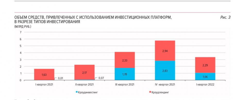 Краудфандинг быстро растет, но масштаб рынка пока еще невелик. Темпы роста рынка краудфандинга в 2021 году были выше, чем в 2020-м: в 2021 году объем привлеченных денежных средств увеличился на 97% (с 7 млрд рублей до 13,8 млрд). В начале 2022 года объем рынка краудфандинга в стоимостном выражении сократился на 2,4 млрд рублей, или на 42%, по сравнению с четвертым кварталом 2021 года, но во втором квартале снова началось оживление.